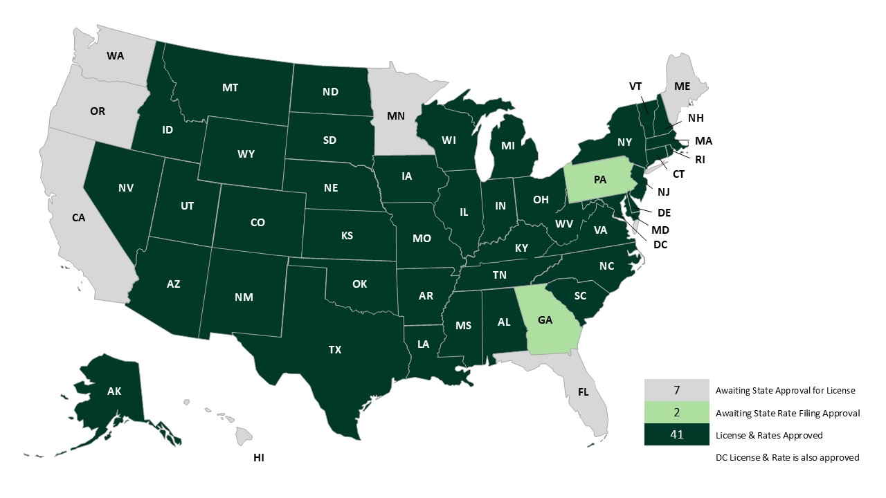 Since then, we have been working to have FFAC licensed (with approved rates) in all 50 states. FFAC has currently been approved in the following states: Alabama (AL), Alaska (AK), Arkansas (AR), Arizona (AZ), Colorado (CO), Connecticut (CT), Delaware (DE), Idaho (ID), Indiana (IN), Iowa (IA), Kansas (KS), Kentucky (KY), Louisiana (LA), Maryland (MD), Massachusetts (MA), Mississippi (MS), Missouri (MO), Montana (MT), Nebraska (NE), Nevada (NV), Michigan (MI), New Hampshire (NH), New Jersey (NJ), New Mexico (NM), New York (NY), North Carolina (NC), North Dakota (ND), Ohio (OH), Oklahoma (OK), Rhode Island (RI), South Carolina (SC), South Dakota (SD), Tennessee (TN), Texas (TX), Utah (UT), Vermont (VT), Virginia (VA), West Virginia (WV), Wisconsin (WI).