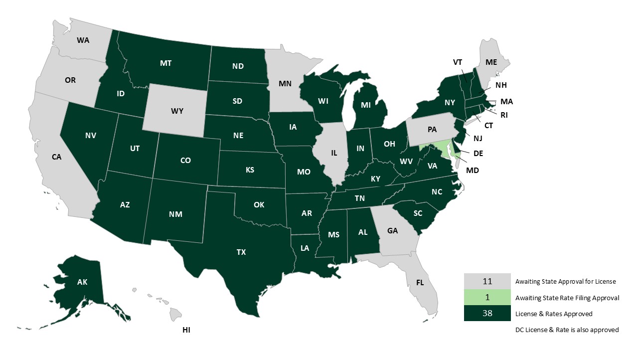 Since then, we have been working to have FFAC licensed (with approved rates) in all 50 states. FFAC has currently been approved in the following states: Alabama (AL), Alaska (AK), Arkansas (AR), Arizona (AZ), Colorado (CO), Connecticut (CT), Delaware (DE), Idaho (ID), Indiana (IN), Iowa (IA), Kansas (KS), Kentucky (KY), Louisiana (LA), Maryland (MD), Massachusetts (MA), Mississippi (MS), Missouri (MO), Montana (MT), Nebraska (NE), Nevada (NV), Michigan (MI), New Hampshire (NH), New Jersey (NJ), New Mexico (NM), New York (NY), North Carolina (NC), North Dakota (ND), Ohio (OH), Oklahoma (OK), Rhode Island (RI), South Carolina (SC), South Dakota (SD), Tennessee (TN), Texas (TX), Utah (UT), Vermont (VT), Virginia (VA), West Virginia (WV), Wisconsin (WI).