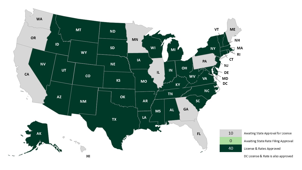 Since then, we have been working to have FFAC licensed (with approved rates) in all 50 states. FFAC has currently been approved in the following states: Alabama (AL), Alaska (AK), Arkansas (AR), Arizona (AZ), Colorado (CO), Connecticut (CT), Delaware (DE), Idaho (ID), Indiana (IN), Iowa (IA), Kansas (KS), Kentucky (KY), Louisiana (LA), Maryland (MD), Massachusetts (MA), Mississippi (MS), Missouri (MO), Montana (MT), Nebraska (NE), Nevada (NV), Michigan (MI), New Hampshire (NH), New Jersey (NJ), New Mexico (NM), New York (NY), North Carolina (NC), North Dakota (ND), Ohio (OH), Oklahoma (OK), Rhode Island (RI), South Carolina (SC), South Dakota (SD), Tennessee (TN), Texas (TX), Utah (UT), Vermont (VT), Virginia (VA), West Virginia (WV), Wisconsin (WI).
